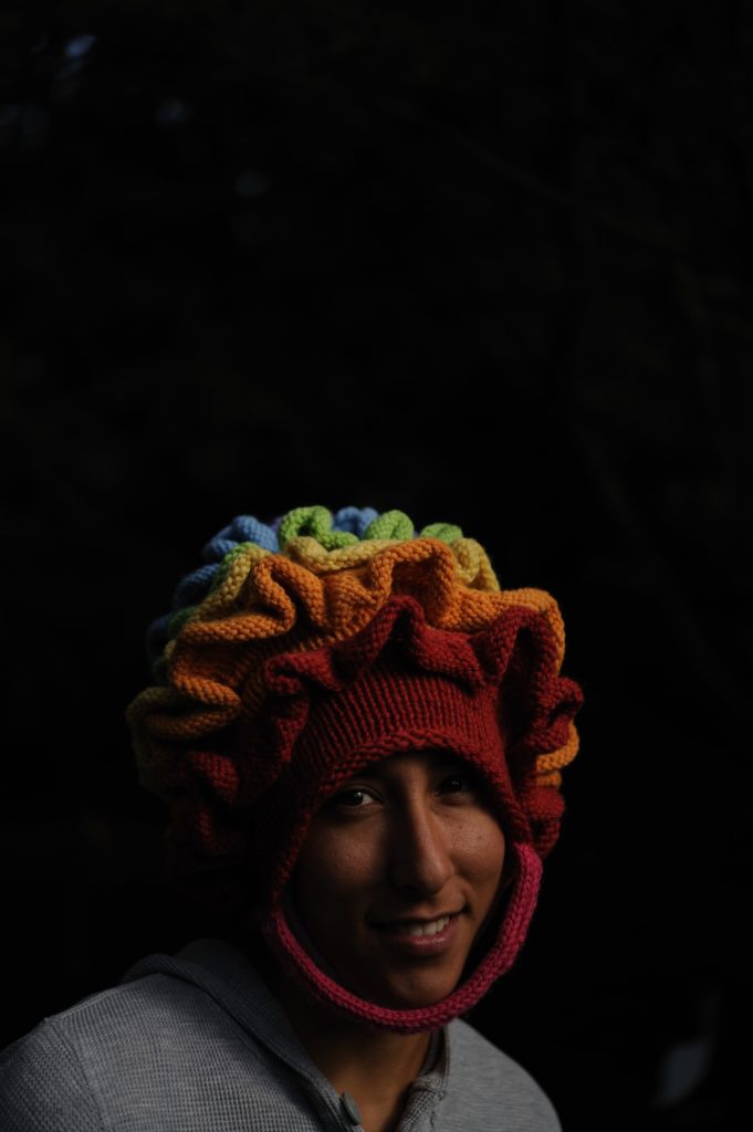 Modelled by Chanti above, this piece of headwear is also interactive : one can approach an admiring bystander (familiar or new friend!) and tell them to explore the garland, slipping off the longer of the two securing chin straps as they nestle their hand into the topmost open center of the crown (and if so desired – the brave ones giving you a head massage in the process!). You can gently coax them to tug on the cap to extend it to its full length as they gasp in delight and wonder at the whimsy. To ‘reset’ the design, one merely removes the helmet and pulls the strap back down over the chin, holding the topmost layer securely to your head. The bonnet can be worn scrunched or fully extended depending on style preference, temperature needs, activity level, and proximity of moving machinery.