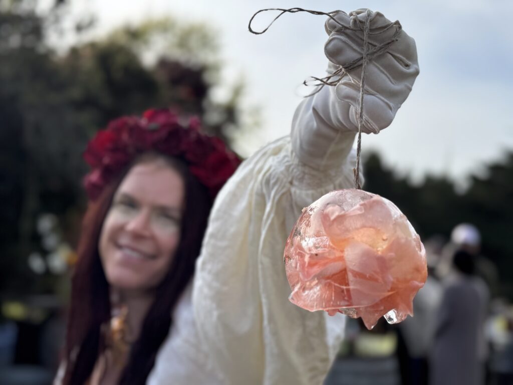 Ephememorials provide primal bereavement catharsis : water becoming a medium – ice a temporary tactile body via Somatic Magic. The container of the solid crystalline surrendering its form provides a potent movement metaphor meditation on mortality and is also a responsive ritual of remembrance + release.